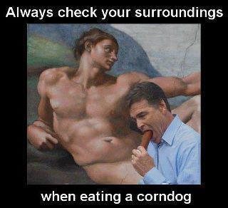 Here’s a little bit of internet humour, and something to think about next time you’re eating a corndog. Texas governor Rick Perry demonstrates how eating a corndog can appear to be so much more.