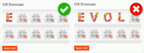 The first gift you send will be the last one on the gift display case, so you need to spell out the message backwards to make it readable! For example, if you’re sending a word like LOVE, make sure to send E-V-O-L.